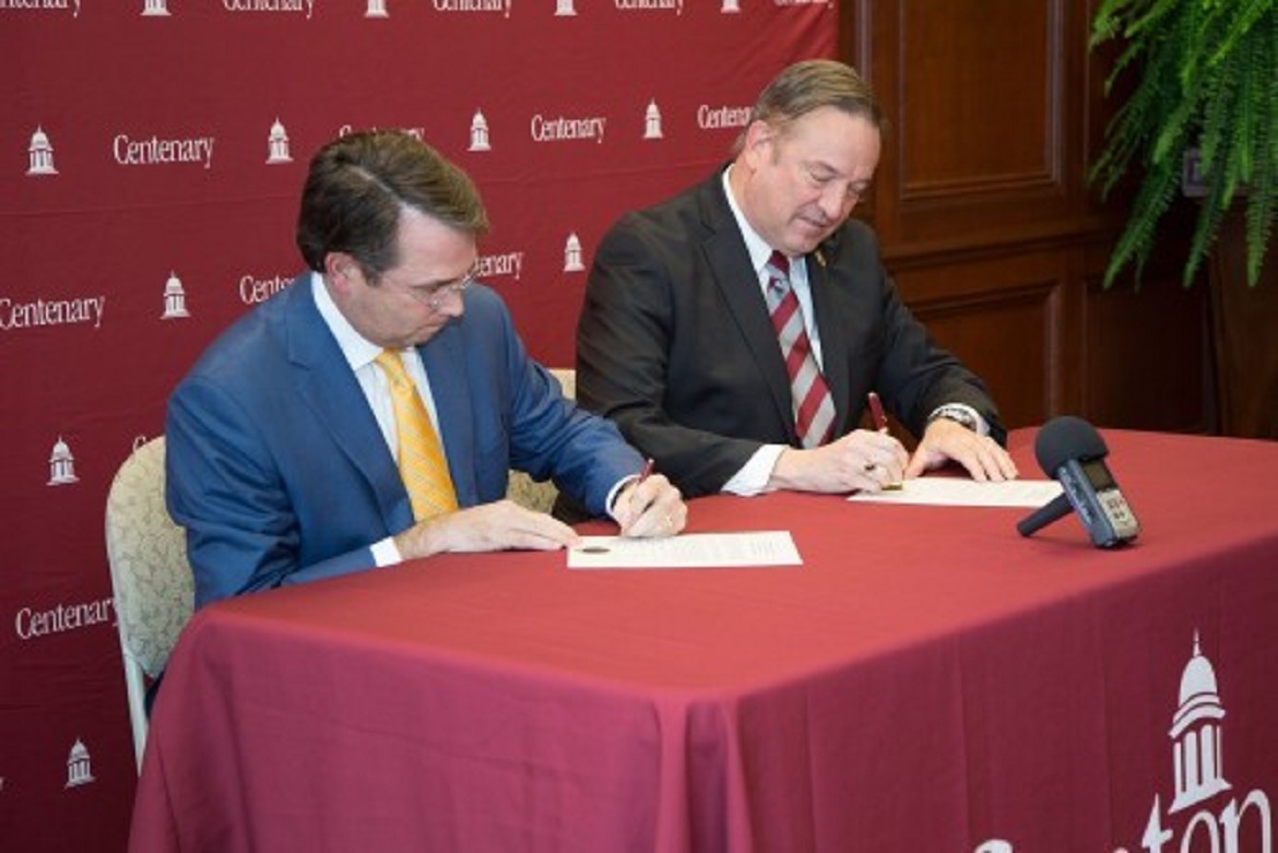 SHREVEPORT, LA — Centenary president Dr. Christopher L. Holoman and Board of Trustees member John E. Atkins signed an agreement creating the William J. Atkins Dean at the College’s Frost School of Business in a ceremony on Friday, September 14. The generous endowment given by the Atkins family recognizes the importance of the Shreveport-Bossier business community and the role of the Frost School of Business in fostering and providing leadership to this community.